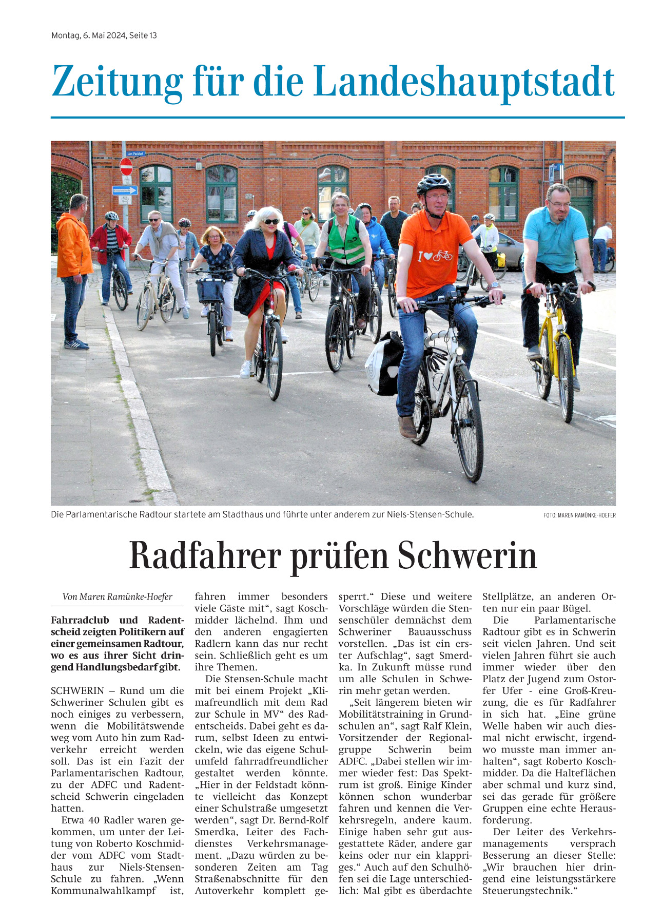 ADFC und Radentscheid laden einmal im Jahr Verwaltung und Politik zu einer Radtour ein. Thema waren dieses Mal vor allem die im Schulradwege-projekt festgestellten Schwachstellen an der Niels-Stensen-Schule in Schwerin.